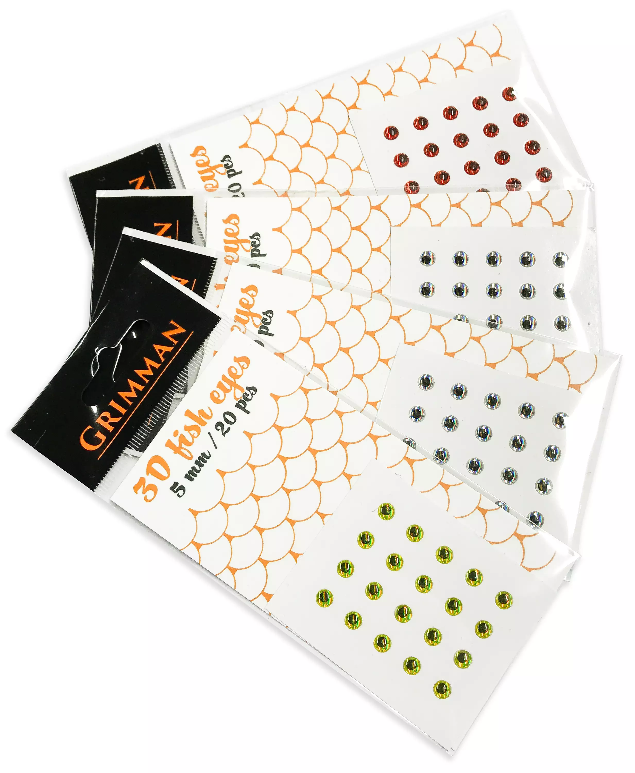 Grimman 3D Fish Eye -klisterögon finns i sex olika storlekar. Storlekarna har en diameter på 3,5, 5, 6,5, 8, 10 och 12 millimeter. Förpackningen innehåller 20 klisterögon. Denna produkt är i storleken 5mm.