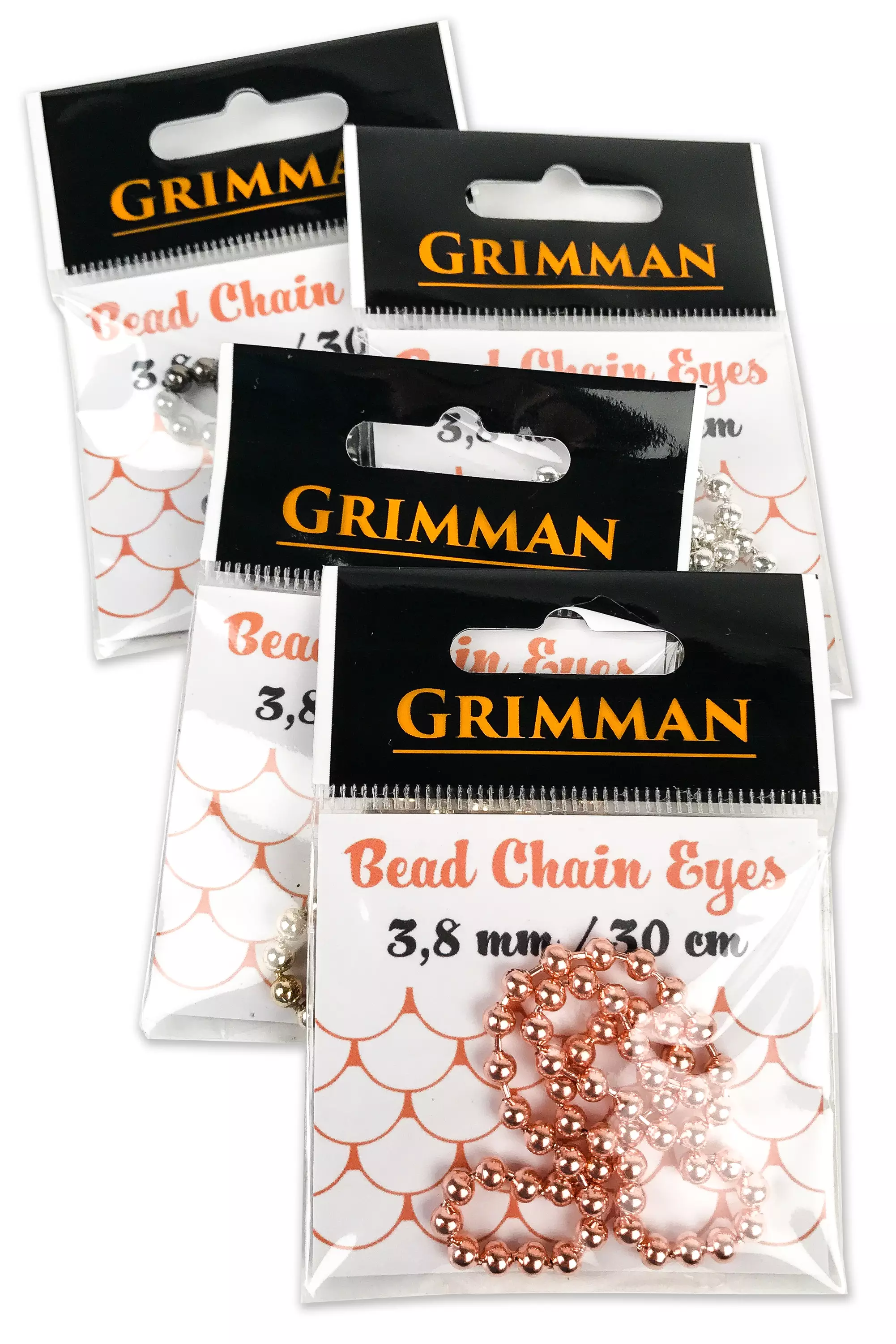 Grimman Bead Chain Eyes är Grimman's version av kulkedjan. Finns tillgängliga i både metallfärger och i mycket ljusa målade fluorescerande färger. Av de tre tillgängliga storlekarna kan du välja den som passar bäst för ditt ändamål. Förpackningen innehåller cirka 30 centimeter kulkedja. Materialet är mässing.