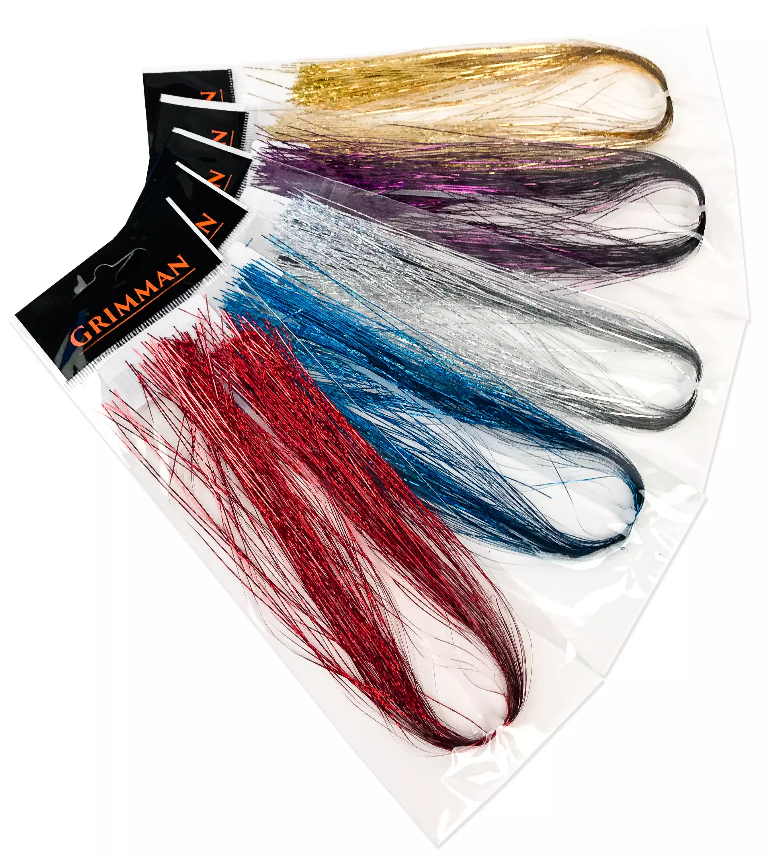 Grimman Salmon Flash är en glitterfiber speciellt utvecklad för laxflugors vingar, tillgänglig i både traditionella metallfärger och holografiska färger. Detta mångsidiga material är också utmärkt för stjärtar på streamers. Fibren säljs i buntar om cirka 100 stycken, och deras längd är 30 cm. Sortimentet innehåller 11 olika färgalternativ.