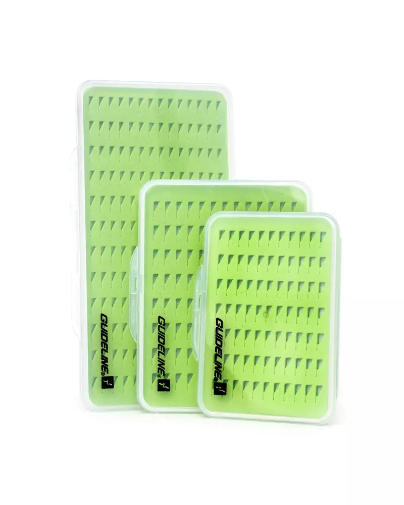 Sammanfattning: denna ask passar användaren som uppskattar lätthet, platt profil och tydlig organisering av flugor. Tre storleksalternativ ger flexibilitet, och den gröna slit-foam-basen underlättar fästning och hittande av flugor när utrustningen ska hållas organiserad.