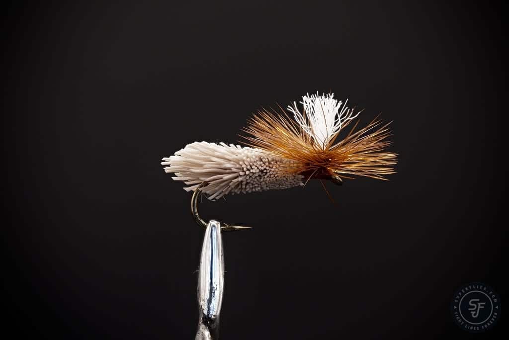 Superflies Jasper Pääkkönen filade länge och noggrant på fallskärmsvingad Caddis-modell. Nu är hjorthåren trimmade till perfektion och flugan är så nära en riktig nattsländas form som möjligt. Det handlar självklart om en av Finlands absolut bästa torrflugor, som oftast kallas Nyblom Caddis eller mer bekant "kädärin". De största storlekarna förtjänar ett eget omnämnande som "Lax-Caddis" – så utmärkta är de för laxfiske på ytan! Kroppens material garanterar också utmärkt flytförmåga – detta är alltså en verklig kvalitetsfluga för asken! Bunden på Daiichi 1170-krok.
