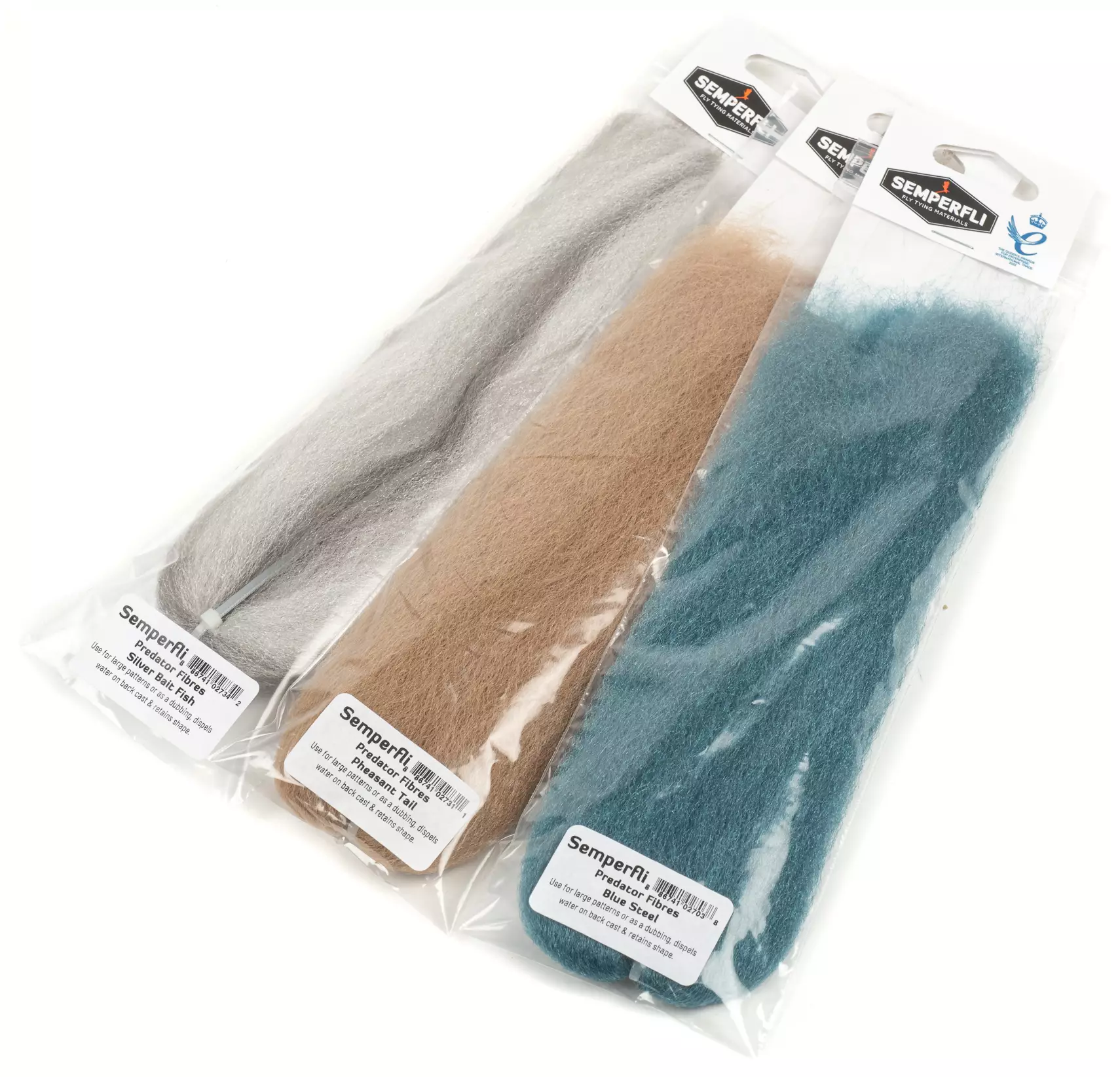 Predator Fibres fungerar också utmärkt i fallskärmsvingar, under vingar på torrflugor eller till och med som dubbingmaterial för kroppar. Varje förpackning innehåller 500 mm långa fibrer som är vikta på mitten. Sortimentet inkluderar också unika blandningar som erbjuder utmärkt värde för pengarna.