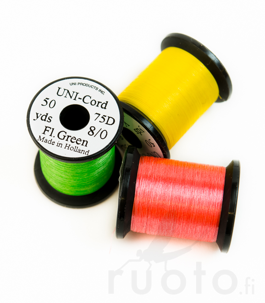 UNI Cord 8/0 75den 50yds – ett mycket starkt och platt bindtråd för flugbindning, speciellt designad för krävande bindningsarbeten. Tråden är tillverkad av gel-spun polyeten (GSP), vilket gör den avsevärt starkare än traditionella trådar av motsvarande tjocklek.