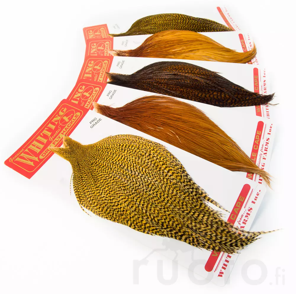 Whiting Dry Fly Cape Bronze Grade tuppar är av högsta kvalitet för torrflugor med fjädrar som har en smidig och hållbar quill. Fjädrarnas fibrer stöter bort vatten väl, vilket innebär att flera falska kast inte behövs, utan flugan torkar snabbt. Bronze grade tuppar har fjädrar för flugor i storlek 10-16.