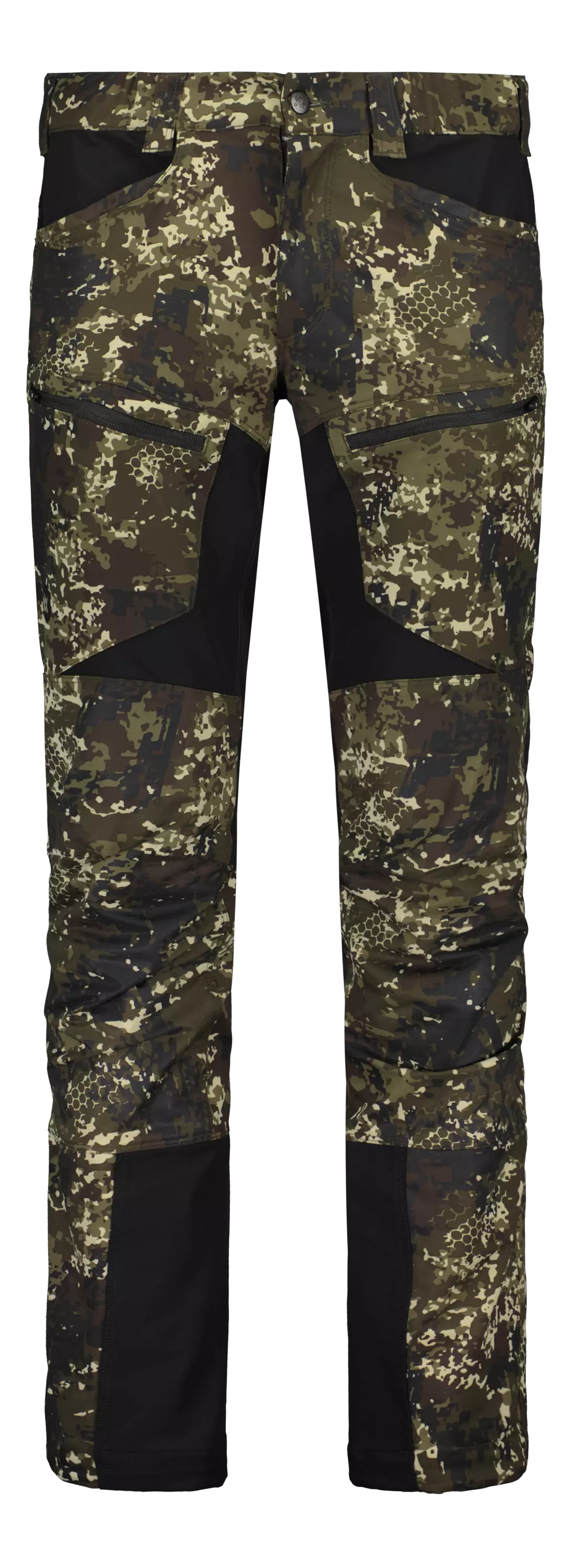 Byxorna har öppna fickor, dragkedjeförsedda lårfickor, ventilationsdragkedjor på sidorna samt snörkrokar vid bensluten. Blind Tech Forest-camouflagemönstret hjälper till att smälta in i skogsmiljön.