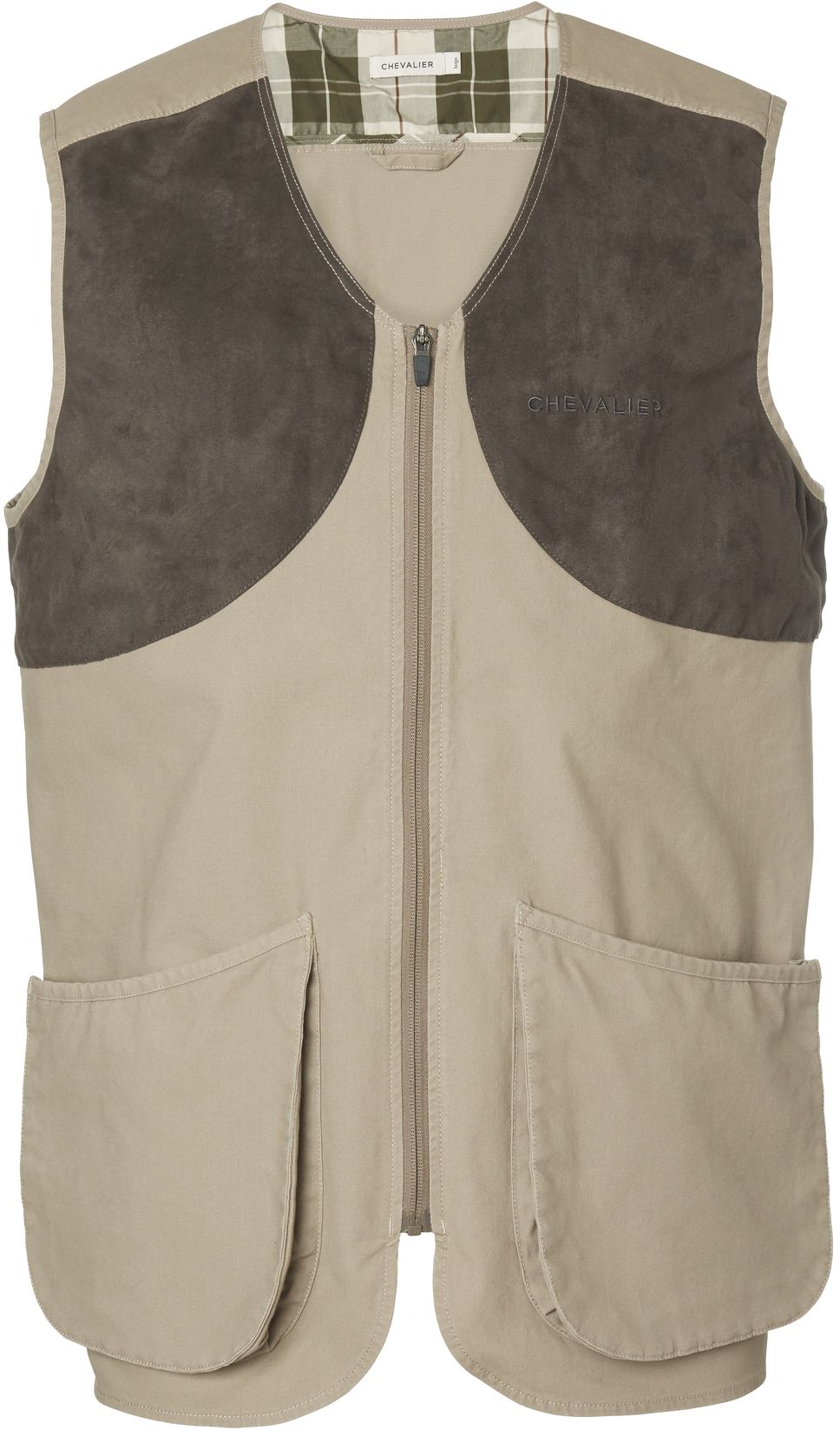 Chevalier Gate Shooting Vest Gate Shooting-västen är en tunn jaktväst i canvas. Passar på våren och hösten när en jacka inte är nödvändig. Du kan bära den över en skjorta eller tröja. Västen har kontrasttyg påsytt under axlarna som sträcker sig ner till bröstet. Fickorna, så kallade bälgfickor, är rymliga. Varje ficka har en dold knapp på sidan som gör att fickan kan utvidgas för att rymma patroner. Innerfickan har ett bomullstyg med Chevaliers eget rutmönster samt en dragkedja. Insidan av kragen har samma rutmönster som förstärkning. Västen har justerbar midja.