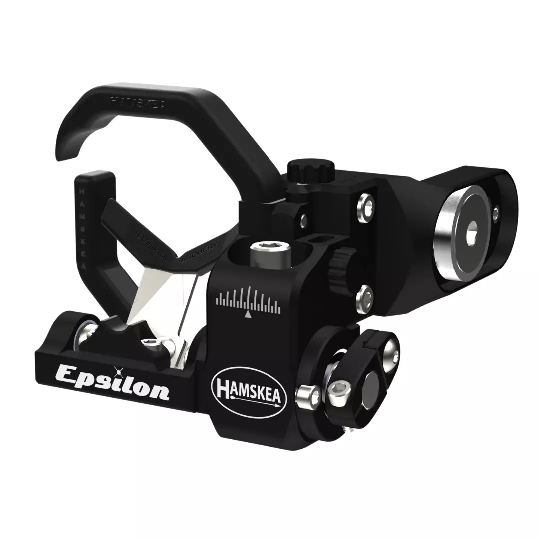 Hamskea Epsilon V2 är en justerbar pilhylla tillverkad av lätt aluminium. Den är designad med låg profil för att passa väl med bågens kropp och mittlinje. Hyllan har mikrojusteringar för höjd och sidled, vilket möjliggör exakt inriktning.