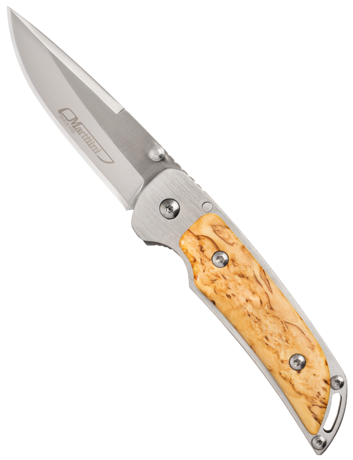 Marttiini MFK Visa Fällkniv är en mångsidig fällkniv som lämpar sig för jakt och fiske samt som ett allmänt verktyg. Knivens 8 cm långa blad är tillverkat av japanskt rostfritt stål och har en satinfinish, vilket garanterar hållbarhet och en elegant look. Handtaget är tillverkat av vacker masurbjörk och har ett bältesclip som underlättar att fästa kniven till exempel i bältet. Denna kniv är ett utmärkt val för de vanligaste täljningarna, såsom att göra stickor, och den är också lämplig för fiske för att blöda fångsten.