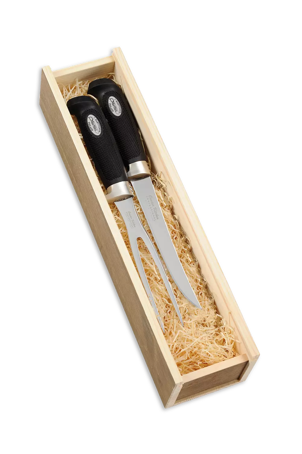 är ett imponerande och praktiskt set för att skära skinka. Det passar naturligtvis även för andra maträtter. Denna skinksetets köttkniv och gaffel utgör ett perfekt par för festbordet. Setet levereras i en elegant trälåda.