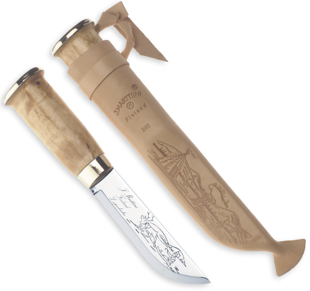 Marttiini Lapinleuku - passar utmärkt för både aktiva användare av knivar, jägare och som en gåvokniv eller souvenir. Det rostfria kromstålet har en vacker etsning med Lapplandstema, och slidan har ett mönster som andas lappländsk exotik.