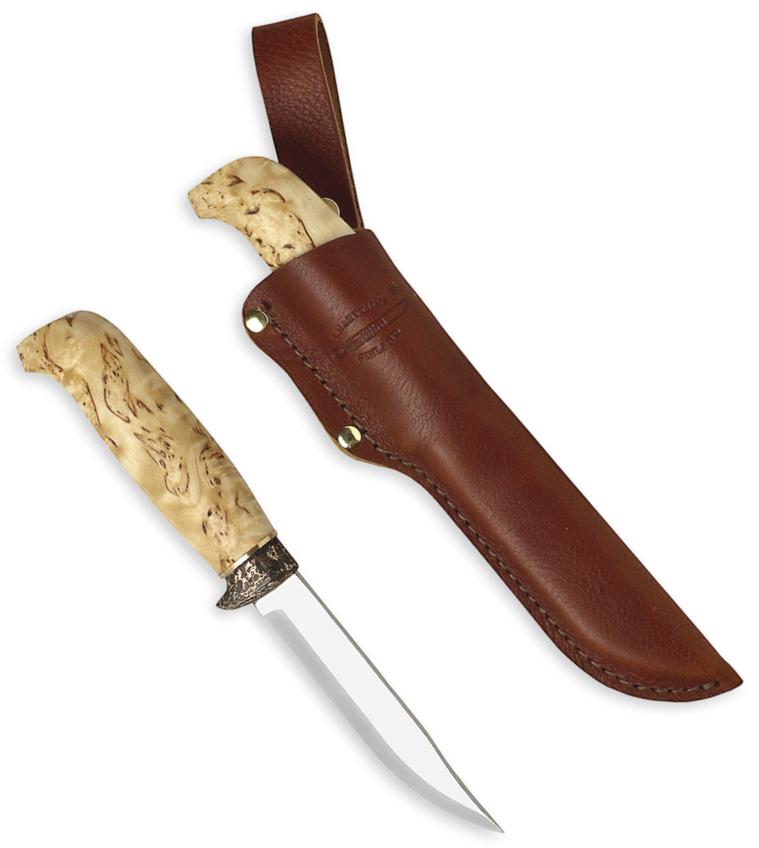 Marttiini Ilveskniv - Traditionell Ilves, förbättrat utseende med brons. Utmärkta användningsegenskaper kombinerade med ett förfinat utseende gör användningen av kniven till en lyx. Det imponerande vaxade masurbjörkhandtaget kombinerat med det vackra bronsfingerguardet gör täljningen till en fest.