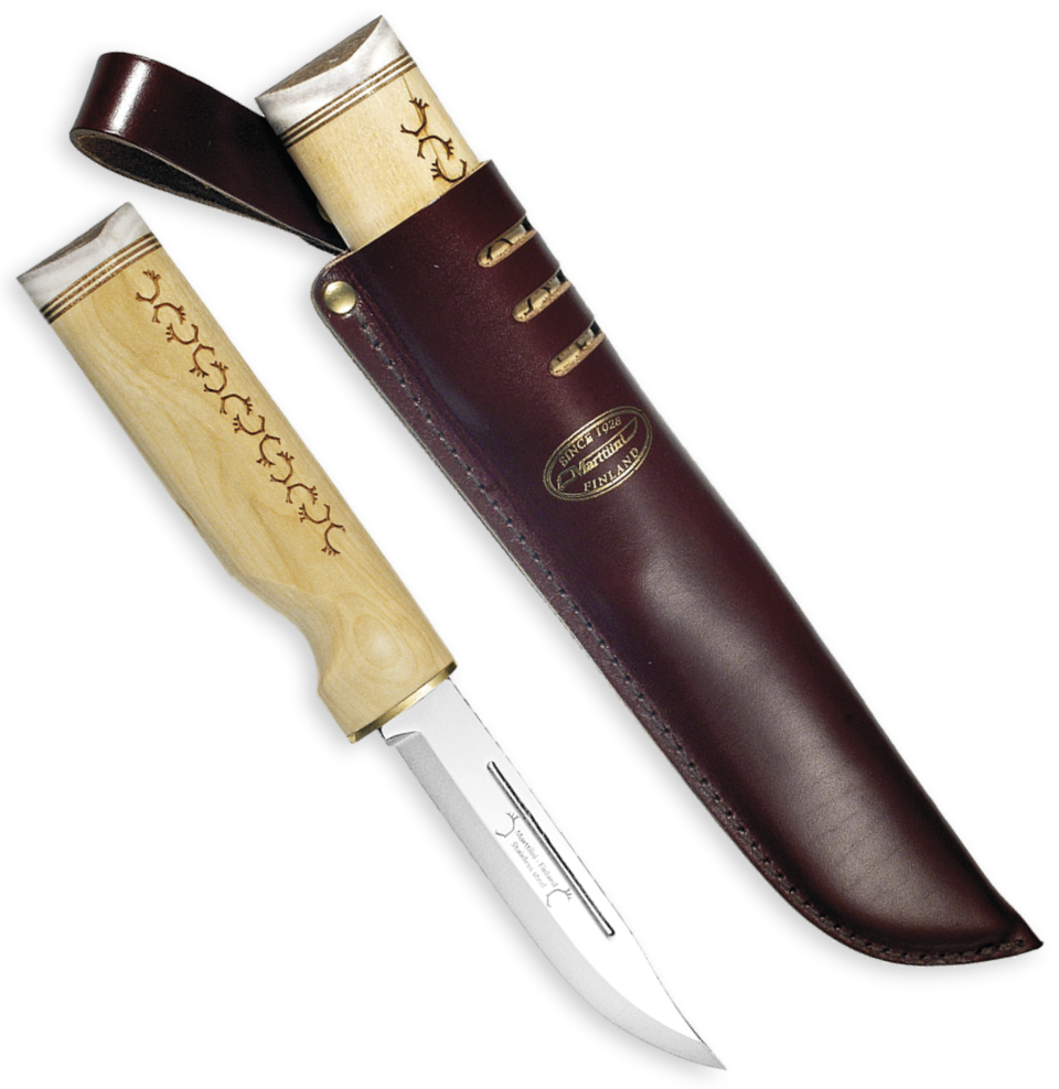 Ilvblad med blodspår, vackert mönstrat skaft av masurbjörk och knopp av renhorn – Pailakka 11 hedrar Nordens traditioner i en ståtlig och praktisk form. Den mångsidiga Pailakka 11 är ett pålitligt verktyg för vildmarksäventyr, som klarar många uppgifter – knivens ilvblad med blodspår och spetsens pannkrok är en ikonisk bladmodell utvecklad av Marttiini på 1930-talet, som fortfarande tjänar vildmarksvandrare idag. Knivens blad av rostfritt stål (1.4034, HRC 53,5-55) är mångsidigt och hållbart, och det finska masurbjörkskaftets design garanterar ett bra grepp. Knivens namn Pailakka betyder en otämjd renoxe.
