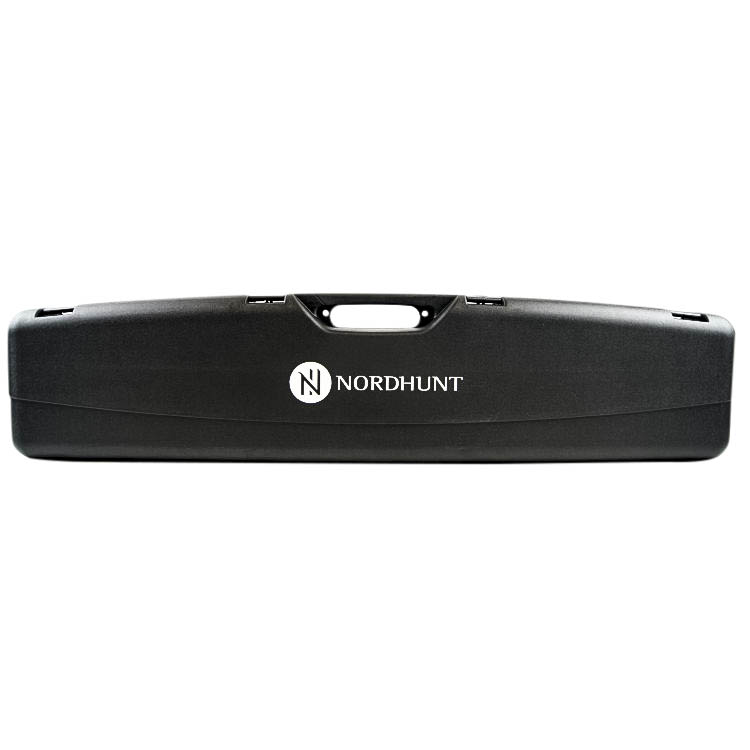 Nordhunt Vapenfodral är en svart, hård transportväska som är designad för gevär. Väskan har en elegant Nordhunt-logotyp på locket, och dess insida är vadderad, vilket skyddar vapnet under transport. Väskan är utrustad med fyra högkvalitativa lås och har platser för små hänglås, vilket ökar säkerheten. Detta gör väskan både praktisk och säker för transport av vapen.