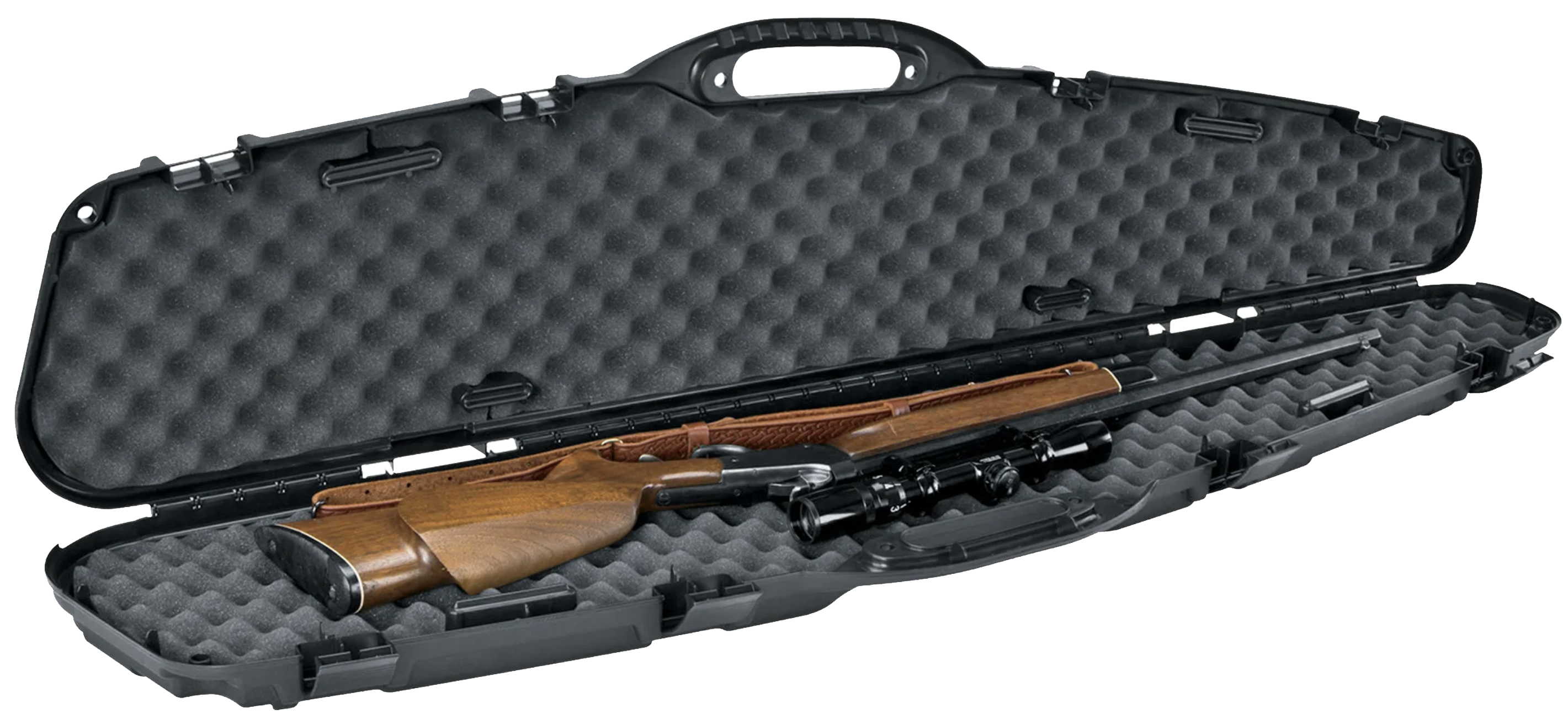Plano Gevärväska - Pro-Max® Formad gevärväska använder den patenterade PillarLock®-teknologin, som ökar hållbarheten för att skydda ditt vapen. Den passar för ett gevär med kikarsikte och stor objektivlins. Den tjockväggiga konstruktionen, hållbara lås och formade bärhandtag gör denna väska till en premiumväska.