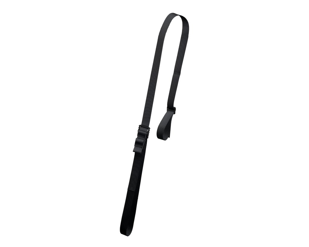 Detta är i all sin enkelhet en enkel tvåpunktsrem. Du behöver inte hantera flera olika remändar och spännen, bara två. 25 mm brett band passar de flesta remöglor och olika snabbfästen.