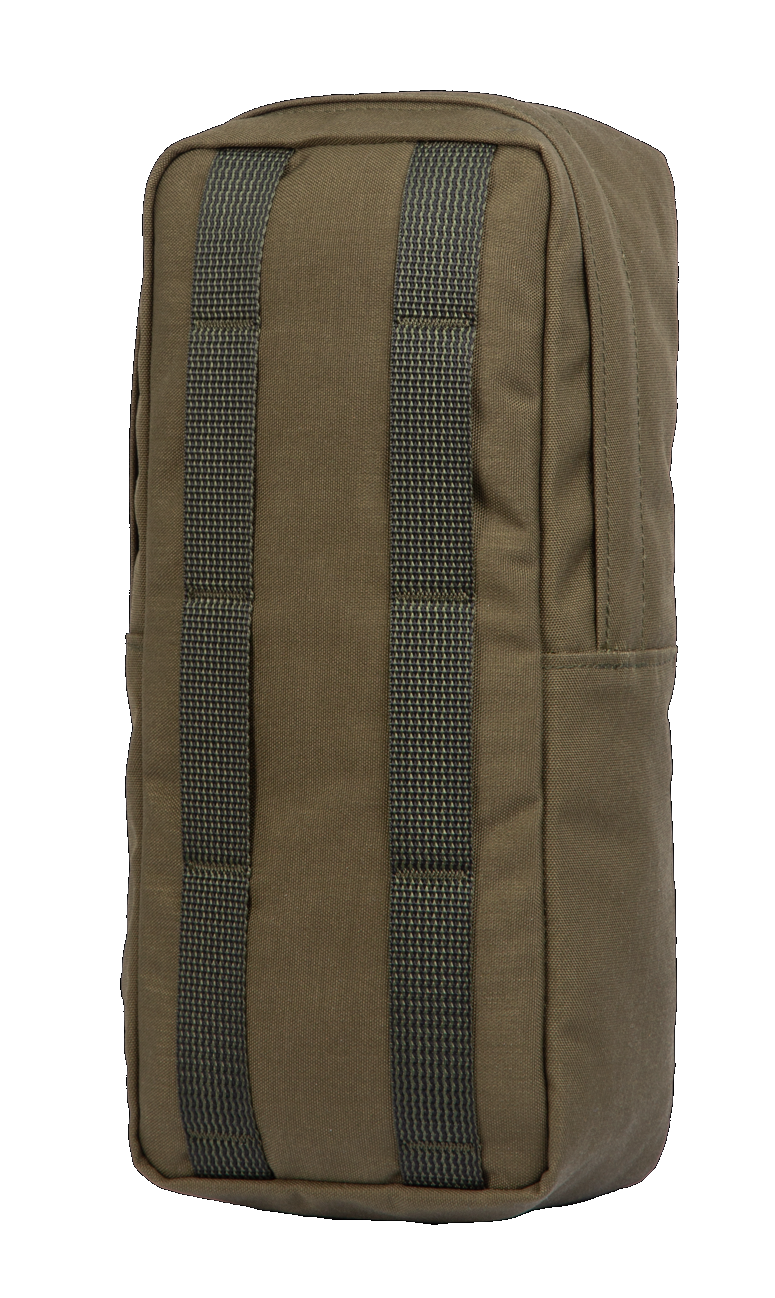 Baksidan har våra vanliga PALS-fästen med vikbara ändar. De mellersta horisontella bandkanalerna har utelämnats, de erbjöd inget annat än extra vikt. Även om vi inte är någon ultralätt utrustningstillverkare så gillar vi inte onödig vikt. Optimal fästning kräver en PALS-kanal som är tre kanaler bred och fem (minst fyra) bandrader hög. Ryggsäckens sidokompressionsremmar förhindrar att fickan och dess innehåll skramlar när de är åtdragna. 4L sidoficka passar alla ryggsäckar i Jägare-serien.