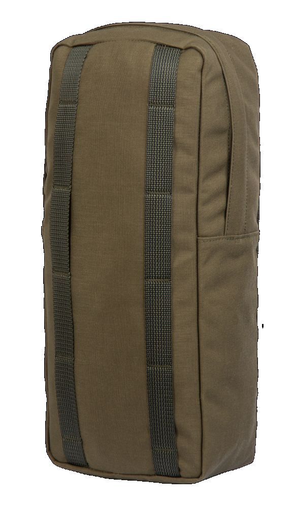 På baksidan finns våra vanliga PALS-fästen med vikbara ändar. De mellersta horisontella bandkanalerna har utelämnats, de erbjöd inget annat än extra vikt. Även om vi inte är någon ultralätt utrustningstillverkare så gillar vi inte onödig vikt. Mellan de två vertikala PALS-fästbanden på fickan finns ett utrymme på cirka 9 cm, vilket möjliggör att bära yxor, spön etc. instoppade bakom fickan. Optimal fästning kräver en PALS-kanal som är fyra kanaler bred och sju (minst sex) bandrader hög. Ryggsäckens sidokompressionsremmar förhindrar att fickan och dess innehåll skramlar när de är åtdragna. Av våra egna ryggsäck-/rammodeller rekommenderar vi 8L side pouch endast för Jääkäri XL-ramen. Även om det inte är rekommenderat så kan fickan fästas på mindre ryggsäckar som har minst fem rader PALS-kanaler på sidorna (t.ex. Jääkäri M och L), detta görs genom att fästa fickan en nivå högre och acceptera att fickans botten är lite löst fäst.