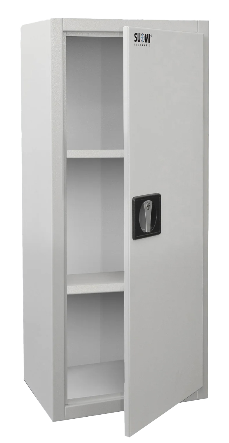 Suomi Ammo L patronkabinett är avsett för förvaring av skjutvapenpatroner. Den finska vapenlagen kräver att vapenägare förvarar patroner i ett låst skåp. Det låsbara Ammo L-patronkabinettet är tillverkat av 1,5 - 2 mm plåt och har fästhål för att fästa skåpet. Fästskruvar ingår också i leveransen. Skåpet har två mellanliggande hyllplan vars avstånd kan justeras. Ytorna är pulverlackerade i vitt (RAL 9010).