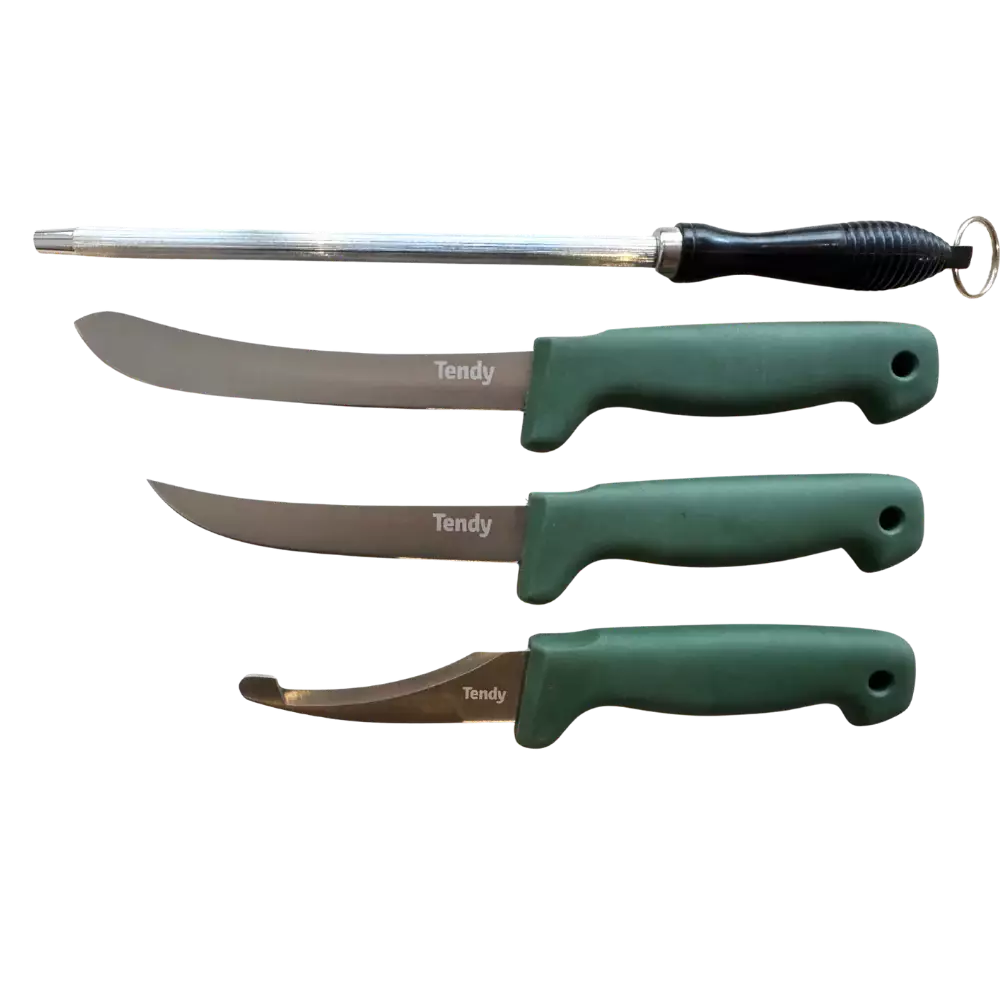 Tendy Butchering knife set – ett omfattande knivset som är speciellt utformat för slakt och köttstyckning. Detta set innehåller allt som behövs för effektiv och kontrollerad hantering av kött.