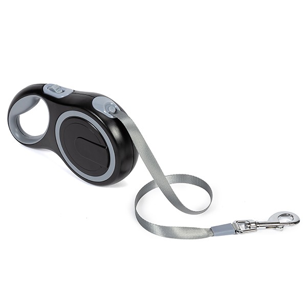 Hundra Rullkoppel för hundar som väger upp till 30 kg. Detta rullkoppel har ett 5 meter långt brett bandkoppel, utrustat med en hållbar avtryckarlås. Låsning och frigöring av kopplet sker enkelt med tummen, och det greppvänliga handtaget ger ett stadigt grepp för ägaren.