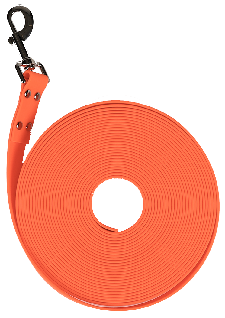 Hundra Training Spårlina, Bred är en bred, handtagslös och hållbar spårlina som är designad för hård användning. Den är tillverkad av väderbeständigt PVC-material som är lätt att hålla rent. Linan har en förzinkad, metallisk pistollås och är förstärkt med dubbla nitar, vilket ökar dess hållbarhet. Den orange färgen gör linan mycket synlig i terrängen.