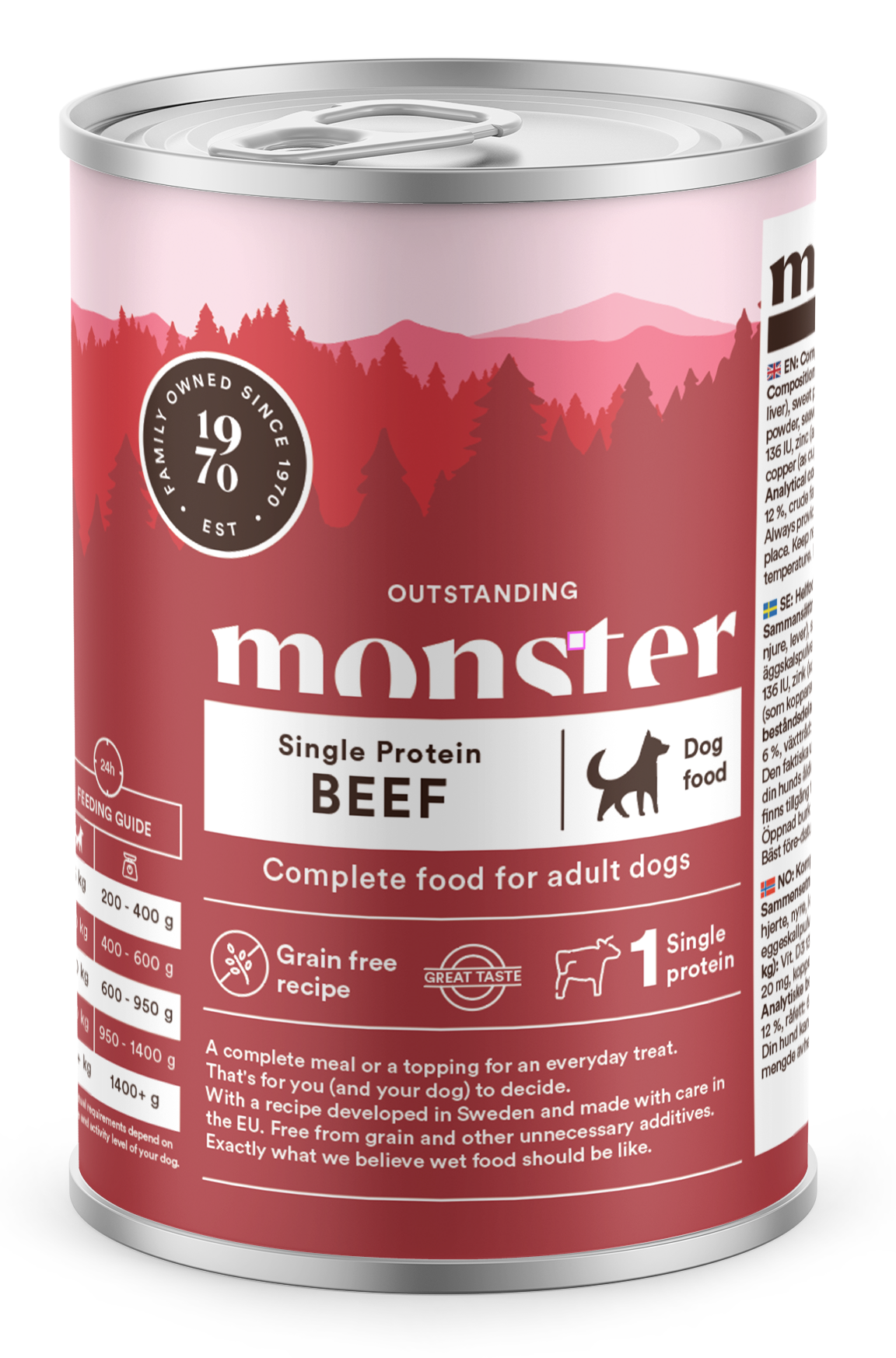 Monster Dog Adult Single Beef 400g är en 100% spannmålsfri, högproteinhaltig och köttig konserverad mat som innehåller läcker nötkött. Kan användas antingen som helfoder eller som en liten lyx i vardagen. Produkten är utvecklad i Sverige och tillverkad av noggrant utvalda råvaror – utan onödiga tillsatser.