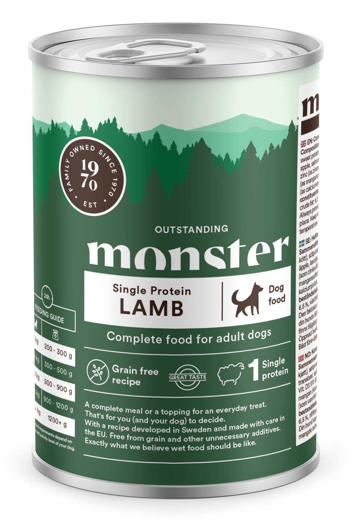 Monster Dog Adult Single Lamb 400g är en 100% spannmålsfri konserverad mat som innehåller mycket hälsosamt lamm. Kan användas antingen som helfoder eller som en liten lyx i vardagen. Produkten är utvecklad i Sverige och tillverkad av noggrant utvalda råvaror – utan onödiga tillsatser!