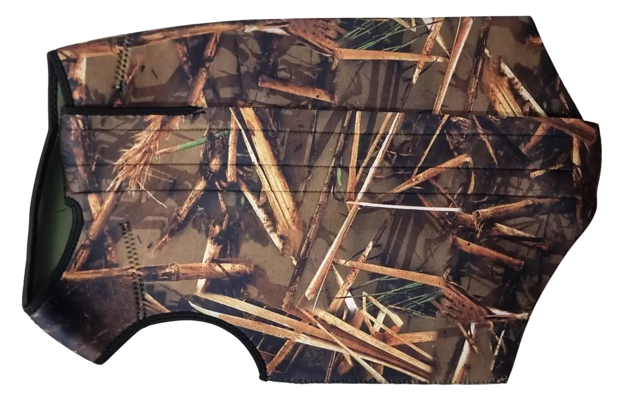 Nordhunt Dog Vest Camo är en säkerhetsväst för hundar, designad för att skydda hunden mot kyla både på land och i vatten. Västen är tillverkad av flexibel 4 mm tjock neopren, vilket gör den bekväm och varm. Utsidan har ett camouflagemönster som ger västen ett stiligt utseende. Västen stängs på ryggen med en stark dragkedja och kardborreband, vilket säkerställer att den sitter bra på plats. Alla framkanter har kantband som ökar komforten och förhindrar skav.