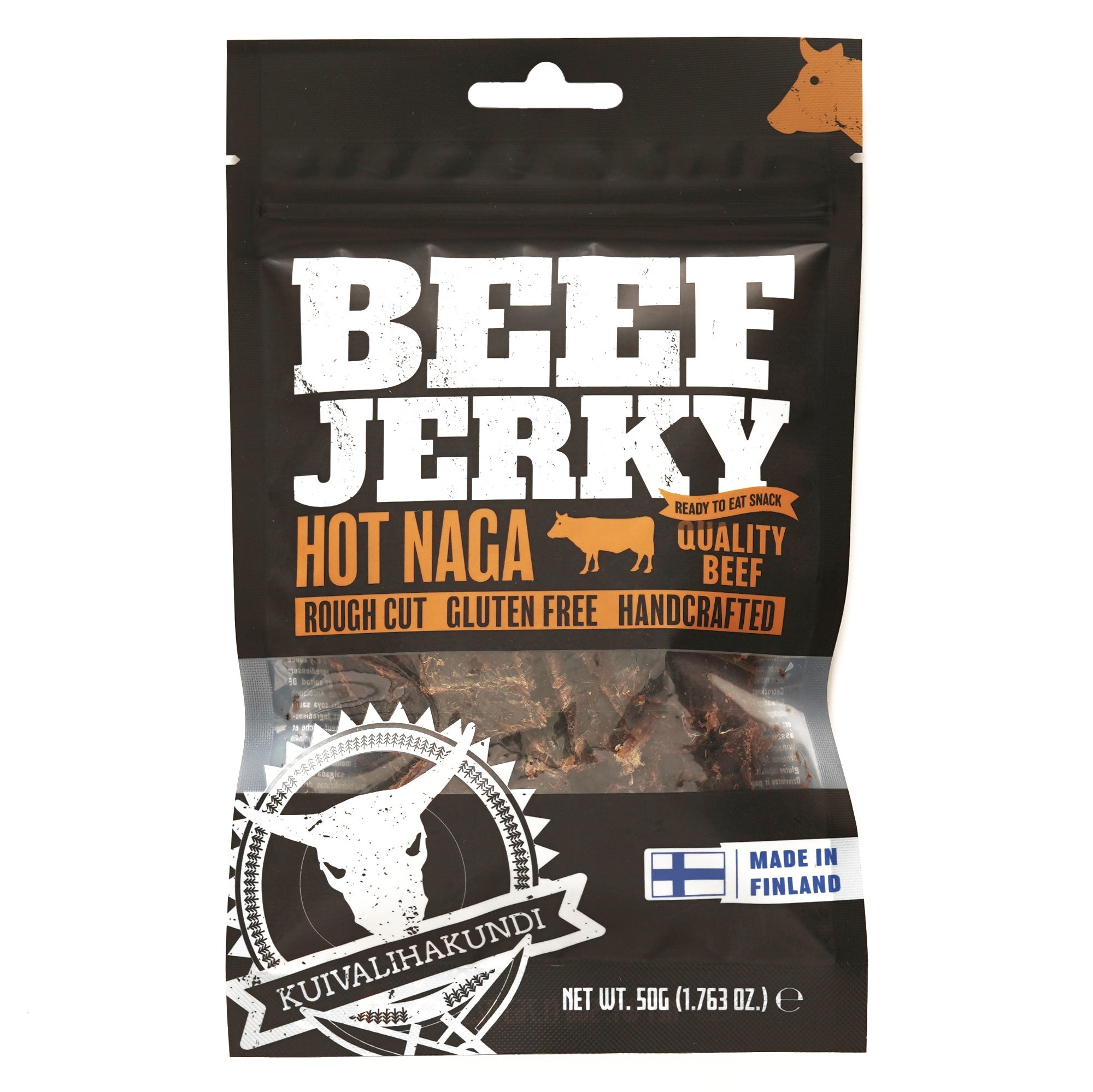 Kuivalihakundi Beef Jerky Hot Naga torkat kött är ett hett inhemskt torkat kött! Man äter inte en påse i taget, eller så gör man det. Värmer skönt. Känns även nästa dag. Ett brännande piggt inhemskt Beef jerky från Kuivalihakundi. Detta torkade kött har tillräckligt med smak och sting för dem som söker det. Ett riktigt snack för älskare av stark mat. Om du tänkte bjuda på detta på släktkalaset, se till att ha en burk filmjölk eller mjölk till hands om hettan är för stark för gammelmormors tandkött.