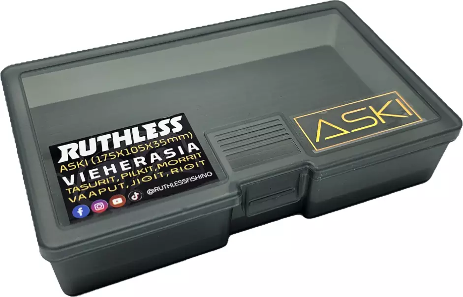 Ruthless Aski Betesask är en kompakt och praktisk betesask som enkelt följer med fiskaren, till exempel i jackfickan. Asken är designad för förvaring av olika typer av beten, såsom balanspirkar, vertikalpirkar, jiggar och riggar. På botten av asken finns ett slitstarkt skårat skum som håller betena stadigt på plats och förhindrar skador under transport.