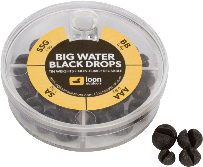 Loon Black Drops 4 Division Big Water Dispenser - viktlåda är en utmärkt följeslagare för den miljömedvetna strömfiskaren. På många strömvatten är användningen av traditionella blyvikter förbjuden och man måste övergå till alternativa material. Loon Black Drops-vikterna är tillverkade av tenn och är helt giftfria för miljön. Dessutom är de lätt återanvändbara tack vare sin form.