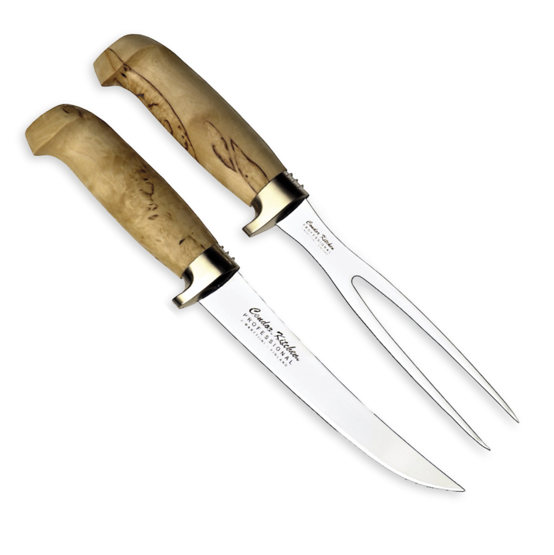 Att skära den första skivan av steken är ett ceremoniellt ögonblick – det är då festen börjar. Och varje festlig måltid förtjänar en bra trancherkniv. Marttiinis Deluxe Skinkset är ett ståtligt set med två verktyg för att skära steken, oavsett om det är skinka, kalkon eller seitan på bordet. Med trancherknivens långa och böjda blad skär du lätt, och med stekgaffeln håller du steken stadigt på plats. Handtagen av finsk masurbjörk har böjda ändar och bestickens fingerskydd säkerställer ett fast grepp. Varje Deluxe Skinkset levereras i en elegant trälåda. Rekommenderas att handdiskas.