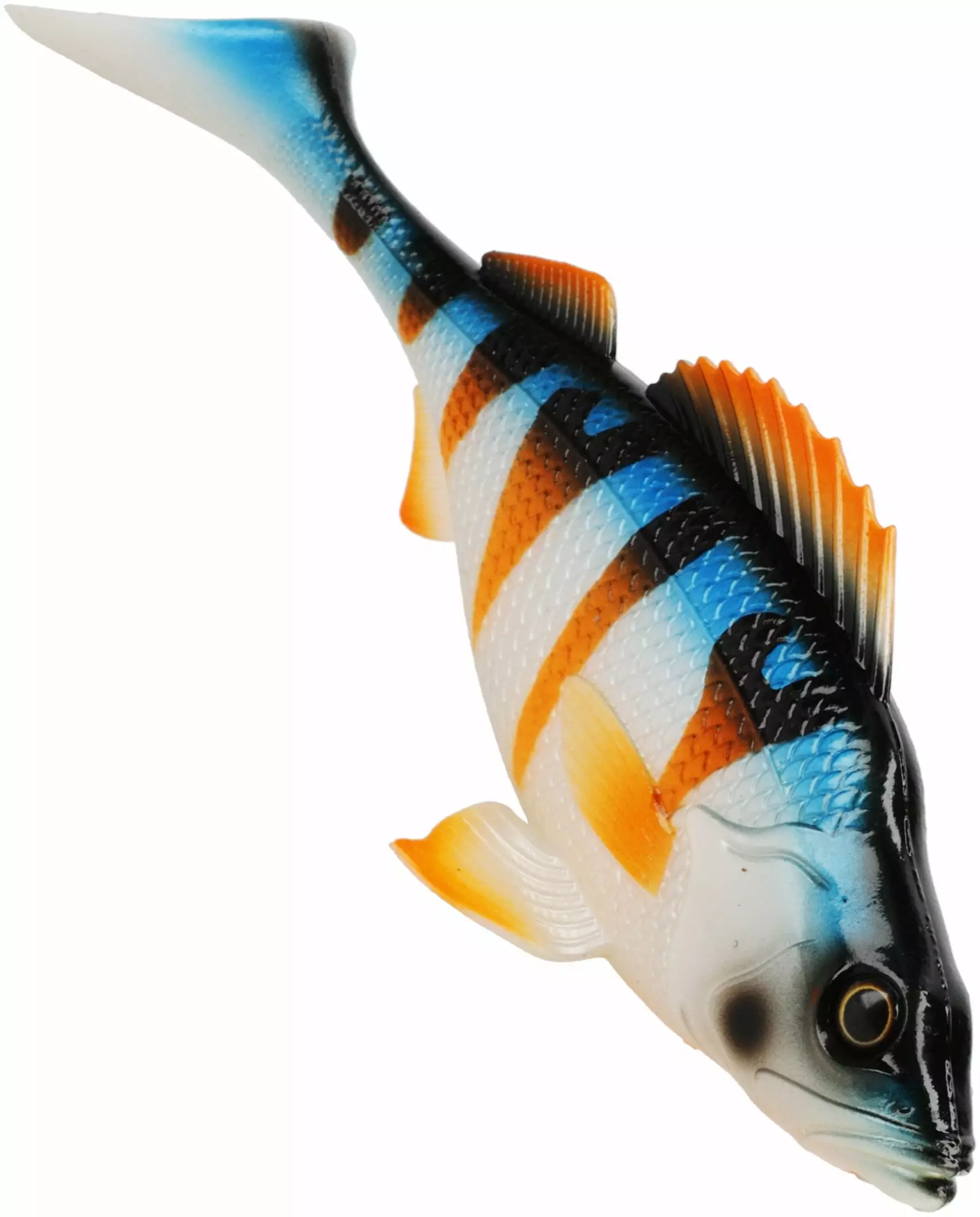 Mikado MFT Perch 25cm är en gäddgummibait som efterliknar abborre, designad speciellt för fiske efter stor gädda. Denna nyhet för år 2025 är utrustad med en stor paddelsvans som rör om mycket vatten och lockar rovfiskar. Dess höga kroppprofil efterliknar stor bytesfisk, vilket gör den till ett effektivt val för gäddfiskare. Betets längd är 25 cm och vikten är 188 g, vilket gör den lämplig för att locka stora rovfiskar.