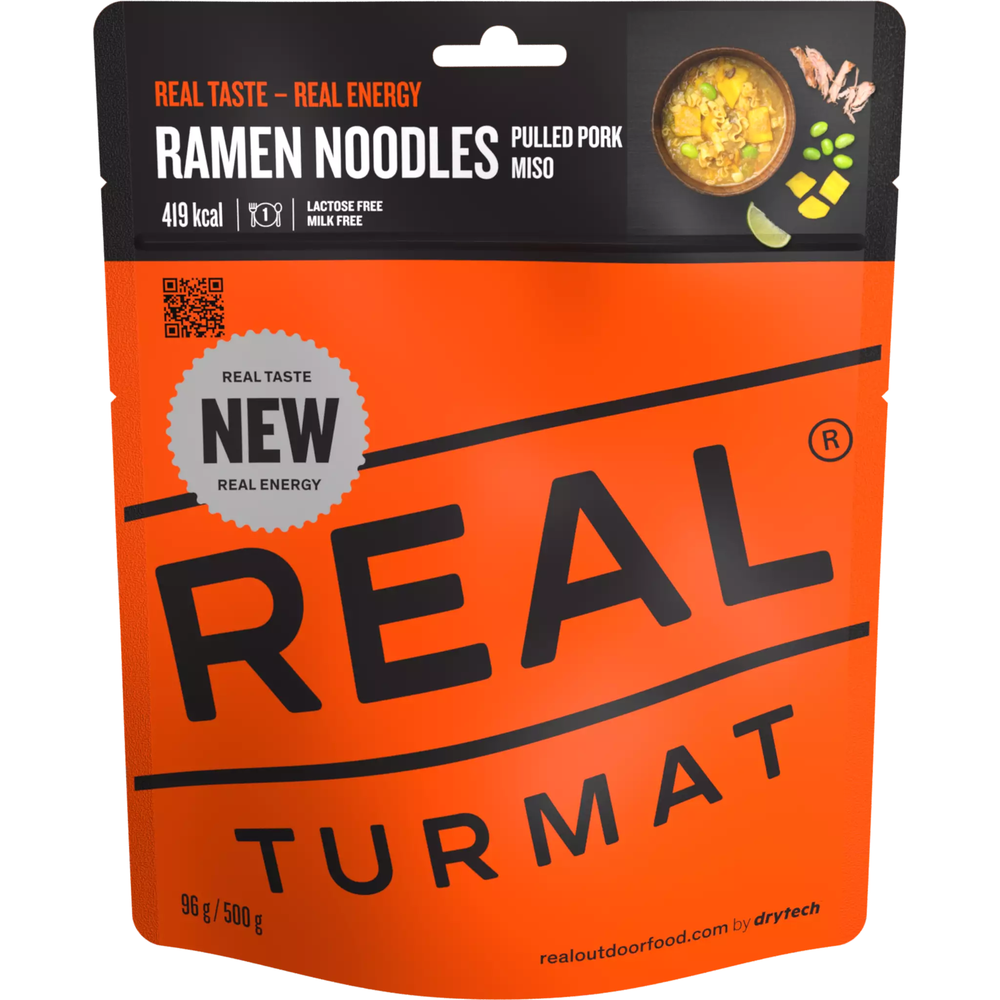 Real Turmat Ramen with Noodles (L) är en praktisk frystorkad friluftsmåltid där enkel tillagning, god hållbarhet och smidig packning står i fokus. Smakbilden bygger på Asian inspired ramen with noodles and pulled pork, vilket gör den lämplig när du vill ha ett snabbt men ändå mättande alternativ. Den torkade strukturen gör produkten lätt att bära med sig, och den färdiga portionen passar bra för vandring, jakt, stugan och beredskapsmat.