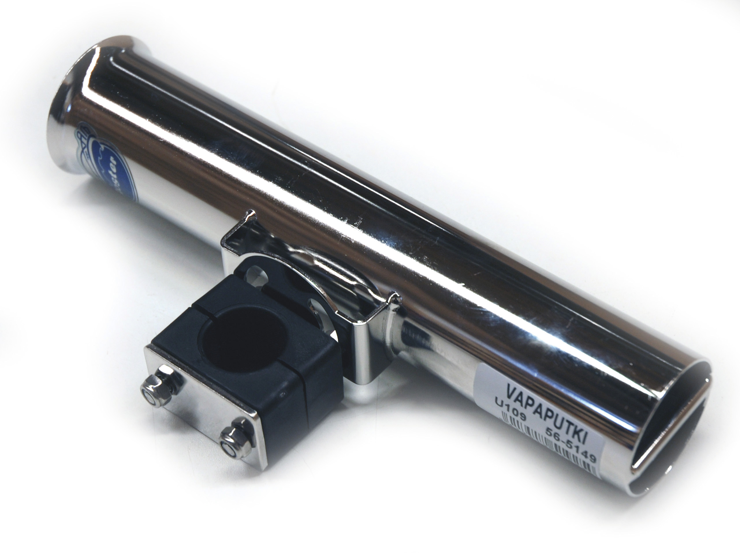 Den är justerbar och lätt att fästa på ett 25 mm rör. Spöhållarens längd är 250 mm, och den erbjuder utmärkt lutningsjustering, eftersom den kan vridas 15 grader åt båda hållen. Hållaren har en traditionell mittmontering, och i botten finns ett 6 mm stöd för trollingstänger. De flesta trollingstänger har ett kors i botten som enkelt låser sig i detta 6 mm stöd.