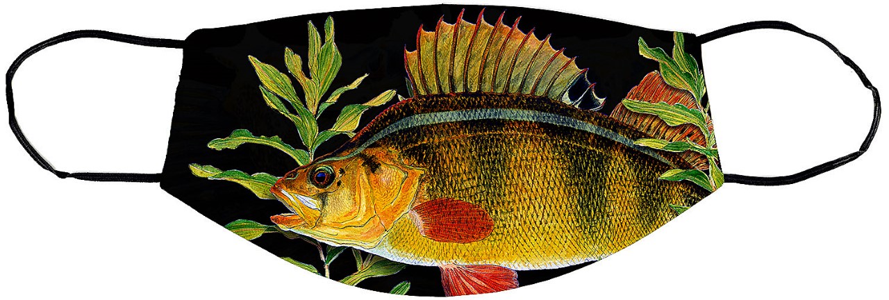 Sakke Yrjöläs stiliga ansiktsmask i tyg med fiskekonst som bländar med sin illustration och hjälper dig att förhindra spridningen av infektionssjukdomar.