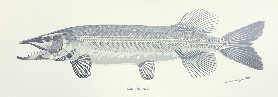 Sakke Yrjölä Gäddans Skelett Affisch - ett fantastiskt mångsidigt gäddskelett tryckt på benvitt 240-grams premiumpapper. En vacker konstaffisch som avslöjar den osynliga muskel- och skelettstrukturen. På väggen en fantastisk detaljerad konstaffisch som man kan titta på länge och som fångar betraktarens uppmärksamhet.