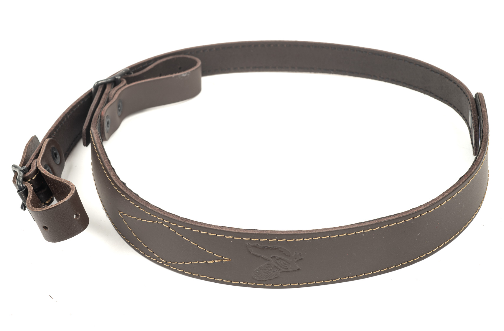 Nahka-Nasta Luxus -vapenrem finns i både brunt, rött och svart. Den stiliga sömmen och viltmotivet fulländar helheten.