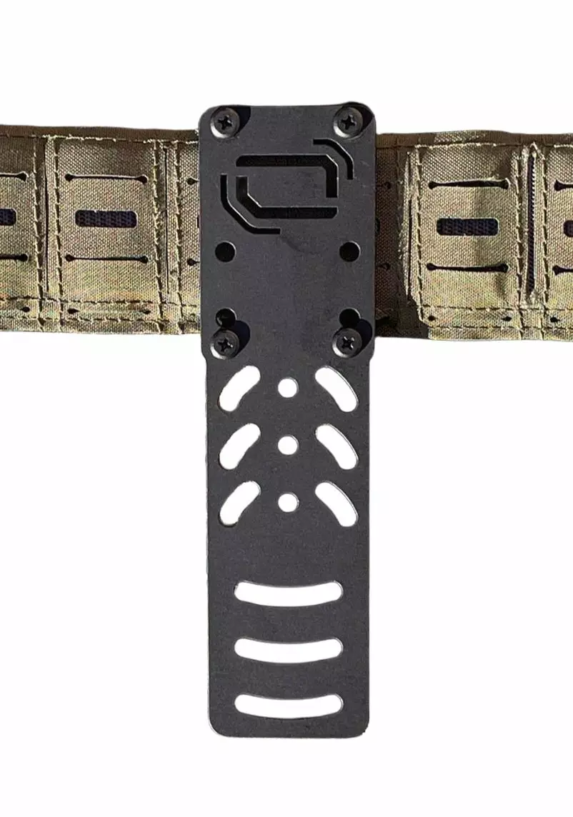 HDM-1-BLK är ett aluminiumfäste för hölster som förbättrar dragvinkeln och placeringen, särskilt med rustning eller utrustning fäst på bältet.