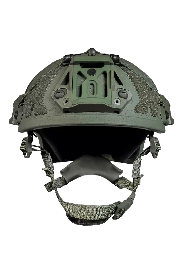 Hjälmen har sidofästen och fästen för tillbehör, NVG-hållare och elastiska fästlinor, vilket gör den mångsidig och anpassningsbar för olika behov.