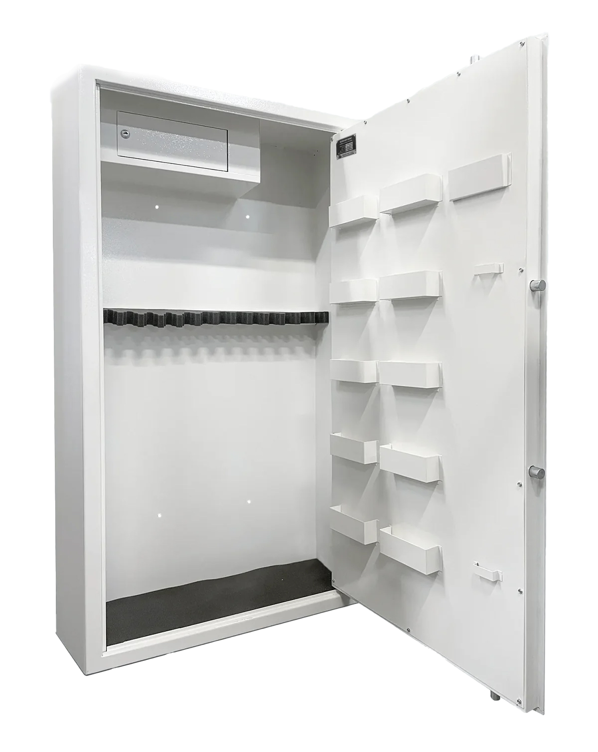 Suomi RS14 vapenskåp är ett certifierat tungt vapenskåp enligt den nya vapenlagen och är lämpligt för förvaring av upp till 14 vapen. Vapenskåpet är testat enligt den krävande EN-14450:2006 S1-standarden och är tillverkat av mycket hållbart 3 mm stål. För låsning används ett inbrottssäkert bultlås samt ett Kaba Mauer 71111 säkerhetslås.
