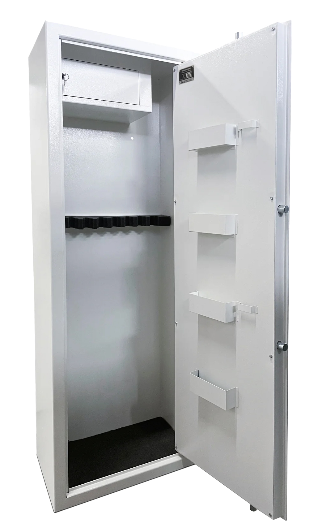Suomi RS8 vapenskåp är ett certifierat tungt vapenskåp enligt den nya vapenlagen och är lämpligt för förvaring av upp till 8 vapen. Vapenskåpet är testat enligt den krävande EN-14450:2006 S1-standarden och är tillverkat av mycket hållbart 3 mm stål. För låsning används ett inbrottssäkert bultlås samt ett Kaba Mauer 71111 säkerhetslås. Ett låsbart övre hyllplan och rymliga öppna hyllor i dörren för förvaring av föremål och patroner. Skåpet kan även bultas fast i golvet eller väggen genom de färdiga monteringshålen.