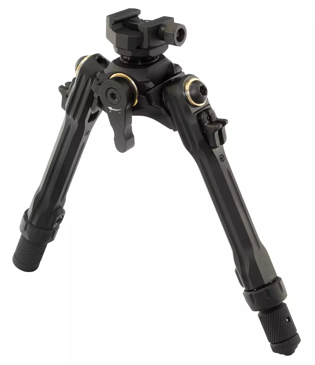 Stödet fästs på en lågprofilerad Picatinny-skena och möjliggör 360° rotation samt lutning i olika riktningar. Benen är automatiskt indragbara och har utbytbara fötter.